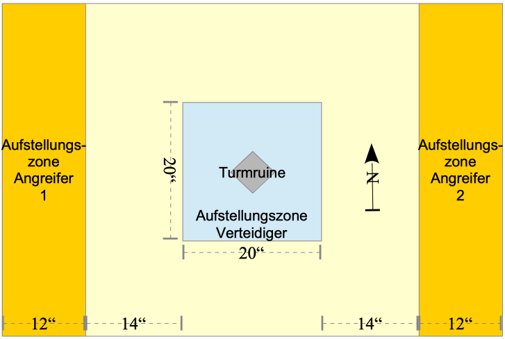 In der Aufstellungszone des Verteidigers wird eine Ruine platziert (bis ca. 6×6“).