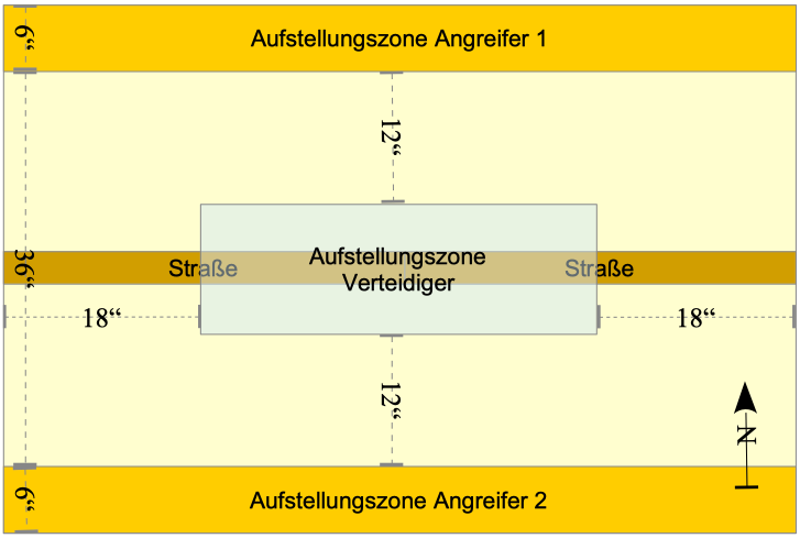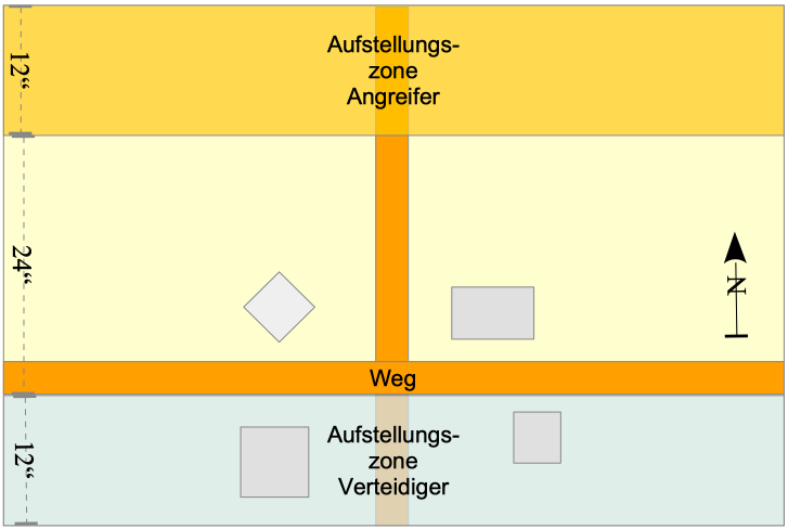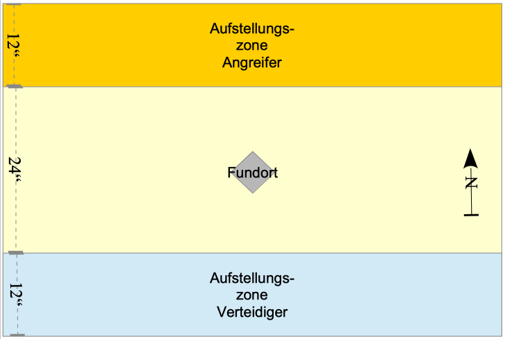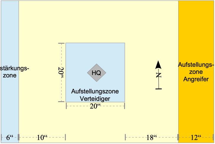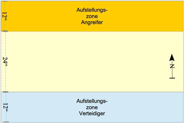 Der Aufbau erfolgt wie auf der Zeichnung zu sehen. Die gesamte Spielfläche ist 6×4 Fuß groß. Falls die Spielfläche kleiner ist, sollten immer zuerst die Aufstellungszonen verkleinert werden, bevor die Abstände der Zonen zueinander verkürzt werden.