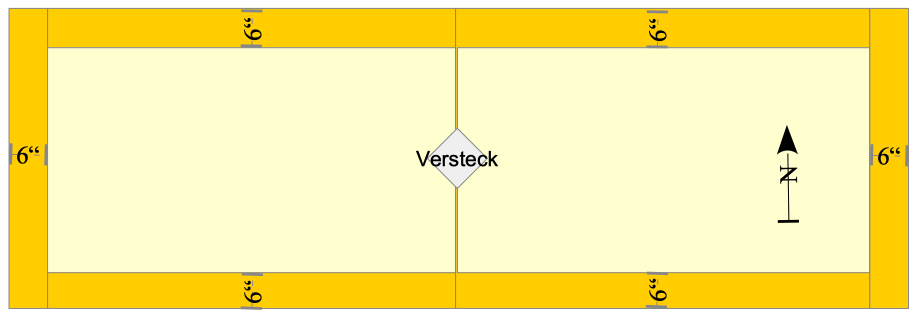 Der Aufbau erfolgt wie auf der Zeichnung zu sehen. Um die Armeen vernünftig aufstellen zu können, werden zwei Spielflächen mit jeweils 6×4 Fuß nebeneinander benötigt.